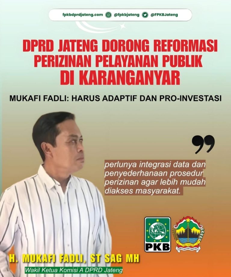 Karanganyar – Anggota DPRD Jawa Tengah menegaskan komitmennya dalam mendorong penguatan tata kelola pemerintahan dan inovasi sektor perizinan guna menopang pertumbuhan ekonomi daerah. Hal ini disampaikan oleh Mukafi Fadli, anggota Fraksi PKB DPRD Jawa Tengah saat kunjungan kerja Komisi A DPRD Jateng di Kabupaten Karanganyar, Selasa (7/4/2026).